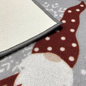 Whimsical Santa Gnome Rug Holiday Accent decor by Simply Holiday. With a trendy Gray Background and lovable Santa Gnomes then sprinkled with Snowflakes makes it Tastefully Simple but Unique with Shabby Chic Elegant Design Style