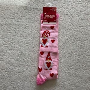 New. Pink knee high socks with gnome heart print. Size 5-9. Reasonable offers welcome.