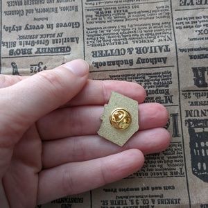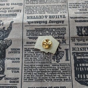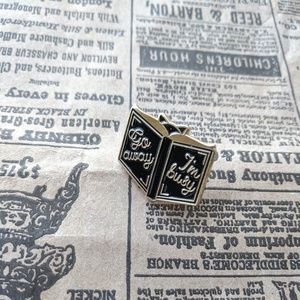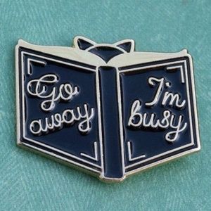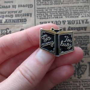 Go Away I'm busy cat book enamel bookworm lapel pin brooch. Pin is in the shape of a book, has cat ears peaking over the book, and says "Go Away I'm busy". Pin is Black enamel set in gold tone metal, pin has a clasp backing. Approximately 1” high. Item is New.