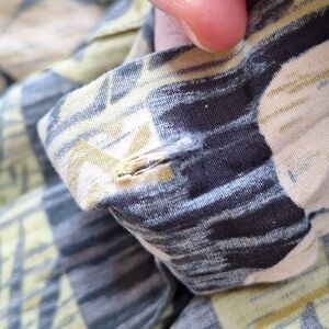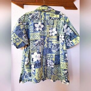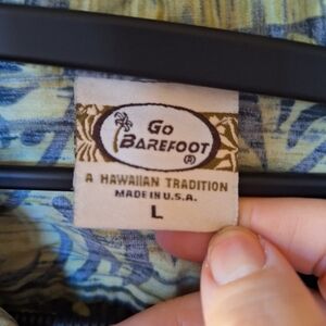 Go Barefoot mens floral tribal Hawaiian short sleeve button down. Front pocket. Lightweight. Relaxed fit. The stitching around the 2nd to the bottom button hole has come undone, still works and you cant tell. Indicated in last pic. Mens size L Pit to pit flat lay 26" length from collar to hem 28.5" measurements are approximate