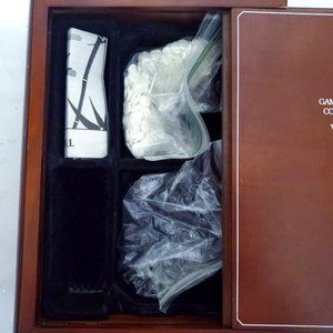 Go Game Set by Gatogi - Library Collection Volume IV. Wooden book case that sits on your shelf like any other book. Comes with board, black and white stones, and rule sheet (sheet does have tear. Seen in photos). The wooden case also has shelf wear but is very sturdy. Slide-out open panel. Everything you need to learn the game of Go!