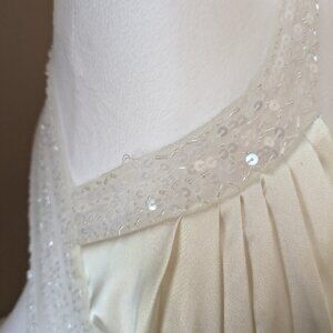 It has been recently dry-cleaned so there are no stains or discoloration but some of the pleats may need to be touched up with an iron. The color is more off a cream or off-white. This dress was never taken in or altered.
