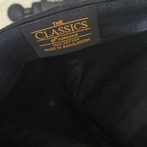 Elegant black cap with a distinctive gold label inside. Perfect for casual wear.