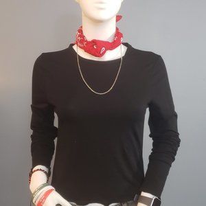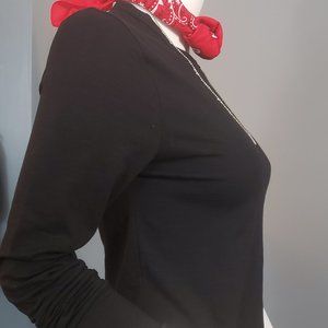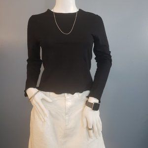 This top is 95% cotton and 5% spandex. Feels comfortable against the skin. The great thing about a black top is that you can do so many things with it. For example, you can layer a colorful tank top under it, or wear a jacket over it for work. The options are unlimited.