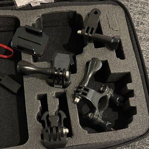 Complete accessory kit for a Go Pro. Includes various mounts, a yellow floating handle, and a protective case. As well as a black zippered case. Ideal for capturing adventures.