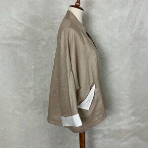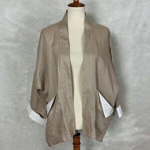 This is a neutral tan beige with white contrast fold over pockets & cuffs, open front, long drop shoulder sleeves, lightweight jacket from Go Silk. Petite medium. 100% linen. No flaws. For reference the mannequin is a size 6-8 with measurements of: 34 in 26 in 35 in.