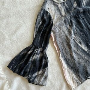 Modern, tie dye print. Soft, silk material. Bell style 3/4 sleeves. Pit to pit 19”. Length 24.