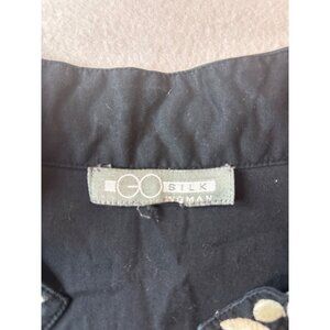 This Go Silk tunic top showcases a beautiful black base with intricate embroidered detailing on the neckline and cuffs. Its versatile design offers both comfort and elegance, suitable for various settings. Made with lightweight silk material, it provides a soft and luxurious feel against the skin.