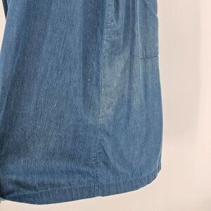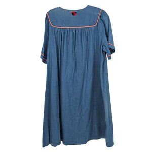 A comfortable denim chambray dress that combines classic charm with whimsical details, offering relaxed styling and practical design for everyday wear.