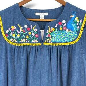Go Softly Denim Embroidered Floral Peacock Patio Dress Sz Medium Full Zip