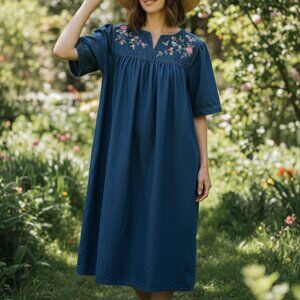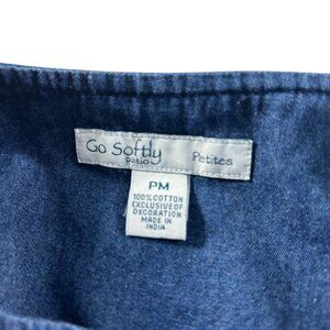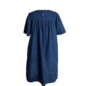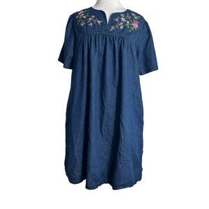 Go Softly Patio Dress Embroidered Floral Bird Petite Medium Pullover Pockets Denim Cotton in preowned condition with a tiny white spot as pictured.