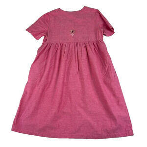 The Go Softly Patio Dress in light pink with floral pattern is a stylish and comfortable choice for casual occasions. Made from 100% cotton denim fabric, this midi-length A-line dress features a smock neck and full button closure, perfect for the warmer seasons of summer, fall, and spring. With short sleeves and pockets, this dress is easy to care for with machine washable instructions, making it a convenient addition to any woman's wardrobe. Ideal for everyday wear, this dress combines a classic style with a touch of vintage charm.