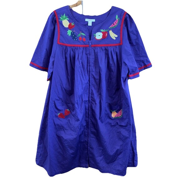 Go Softly Patio Dress Purple Embroidered Pockets 1X Fruit Muumuu Full Zip