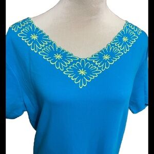 This beautiful Go Softly Patio Embroidered Dress in size M is perfect for any occasion. The dress is made of 100% cotton and features a solid blue color with an embroidered flower design on the V-neckline. The dress is a maxi length with a side slit and collarless design. It is perfect for summer, fall, and spring seasons and can be worn for parties, cocktails, or casual outings. The dress is machine washable and has a pullover closure. The fabric type is knit and the sleeve length is short. The dress is a must-have for any woman's wardrobe.