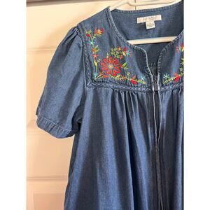Go Softly Patio Retro Denim Dress with Floral Embroidery Size Small 100% Cotton