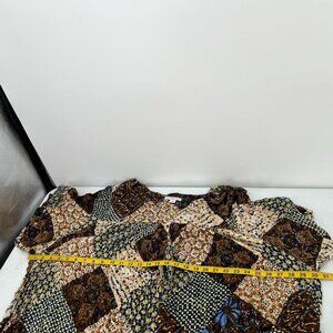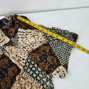Color/Pattern: Patchwork print combining various geometric and floral-like patterns in shades of Brown, Beige, Blue, and Black.