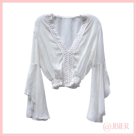 Go With The Flow Chiffon Blouse features a cropped fit and cinches at the waist with bell sleeves and a V-neckline that has embroidered detailing. Excellent condition.