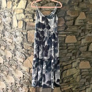 Wear this versatile Go Silk palm print silk dress with flat sandals for a casual look or wedge heels for a dressier occasion. It features a plunging v-neckline and adjustable double spaghetti straps. The fit is generous and flowy with elongated tiers and a raw-finish hem. Side-seam pockets. Gorgeous abstract palm print in varying shades of blue over a white background. New with tags.