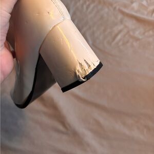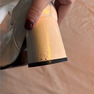 White leather gogo boots. Bought for a disco party. There’s damage to the heels and some scoff marks but kept the plastic on the bottoms. Size 8