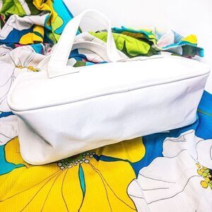 Funky go-go style handbag in faux white leather, two short straps, and sassy, silvertone buckles.