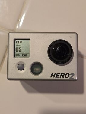 GoPro HERO2 camera in a protective case. Capture high-quality action footage with wide-angle lens and simple one-button controls. Comes with charger, no extra accessories.