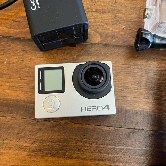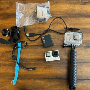 Includes adjustable selfie stick and waterproof carrier attachment. Extra rechargable batteries with charger and cable.