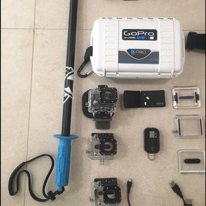 GoPro Hero 3 Black in perfect condition. 3 different cases/housings. UKPRO pole. UKPRO waterproof carrying case. Headstrap. Chest strap. Floaty back door. 64 gb memory card. Battery pac. Wireless remote. Lense replacement kit. 4 curved mounts.