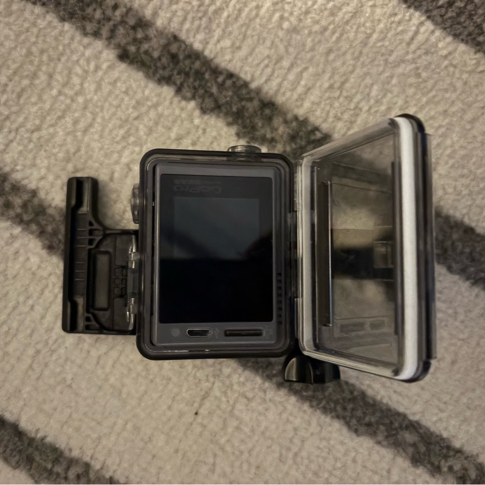 Compact black action camera with a protective case. Ideal for capturing adventures.