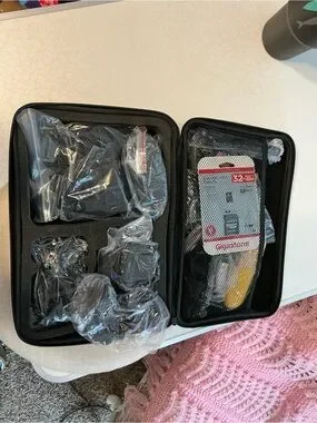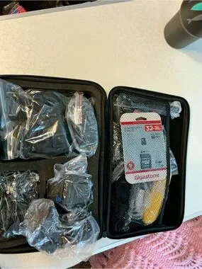 This package has all the parts you’ll need to capture your adventures hands free! Bag did have a sticky tape on it at one time that has left a white residue on it.