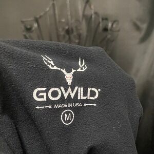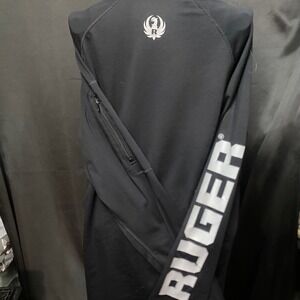 A GoWild quarter zip pullover, perfect for the outdoor enthusiast. This black long-sleeve jacket features a quarter-zip neckline, a zippered pocket on the sleeve, and the Ruger logo on the back. The GoWild logo is on the inside tag. Ideal for layering during outdoor activities, casual wear, or sporting events.
