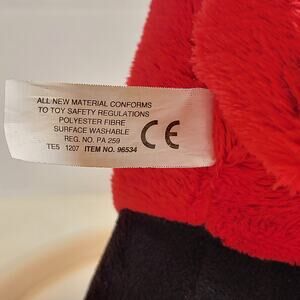 Russ Berrie red plush devil with embroidered hearts, cream muzzle, black hooves and horns, and sleepy eyes. Measures approx. 12" long by 10" tall. Unique Valentine's goat-style plush—surface washable. Item #96534.