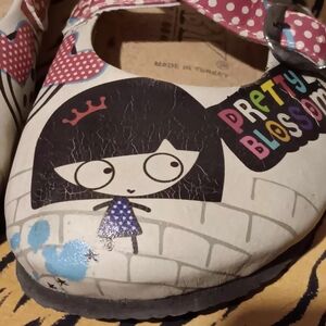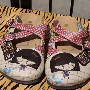 These are Goby brand clogs, likely from their Calceo line, featuring a handcrafted design made in Turkey with a printed artificial leather upper and a poly-cork sole.