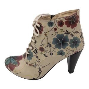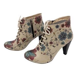Goby Tan Flowers and Butterfly Heeled Inside Zip Boho Ankle Booties 39