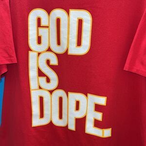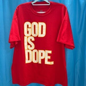 God is Dope T-shirt. Red with white letters outlined in yellow, no rips tears or holes.