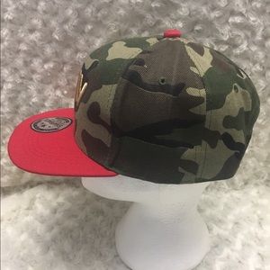 Camouflage w/ Red & Gold....... With the blessings of God , we were able to create the perfect cap. Handmade and crafted to meet our standards of genuine quality and perfection. With the all around good fit , we were able to construct a cap that is durable and comfortable. Our Classic six-panel silhouette features an embroidered logo at the front along with a curved brim (Durable) + stitched grommets at the crown. Complete with an adjustable Custom strapback closure.
