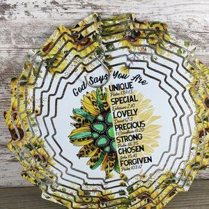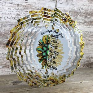 God Says You Are inspirational quote in the middle with a ring of sunflowers on this wind spinner, approx. 10". Will ship flat, you can display it flat or fan it out to your liking. Design is printed on both sides of the aluminum wind spinner.