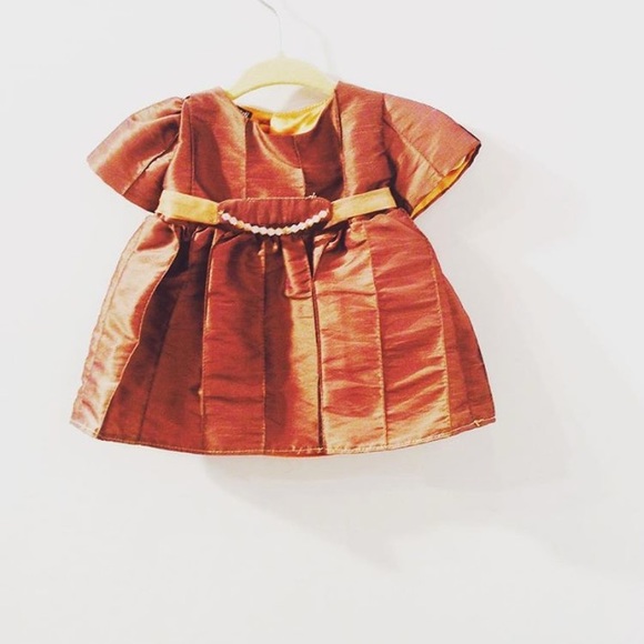 Pleated taffeta w/ beaded belt finished with silk. Full lining.