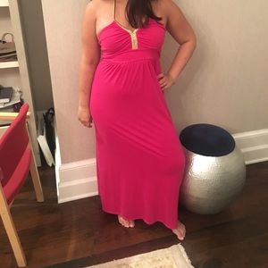 Look like a Greek goddess in this breathable maxi dress. The gold design looks beautiful and complements the pink cloth perfectly.