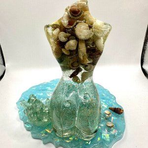 Beautiful custom made Goddess resin statue with holographic accents and seashell decorations. Made by jstarrnyc on Etsy. Perfect condition and great for any ocean beach lover.