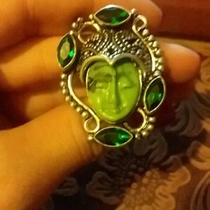 This ring is gorgeous. Very eye catching. Beautiful green stones around the edges, the face is speckled with black. This would be a wonderful cocktail ring or statement piece.