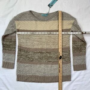 Y2K Goddis Ayden Mocha Cream Pullover Sweater Chunky Knit in beige ivory brown tones. Soft and medium weight, perfect neutral sweater for spring. Fabric content tag missing but I found a photo online from the same sweater.