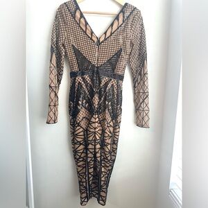 Embrace the allure of the night and make a bold statement with our Geometric Sequin Plunge Midi Dress, a dress designed to captivate during party nights, date night escapades, and unforgettable New Year's Eve celebrations. The plunging v-neckline, adorned with a delicate mesh insert, adds an irresistible touch of elegance, making you the star of the night. With long sleeves, this black midi dress ensures both comfort and style as you enjoy your evening