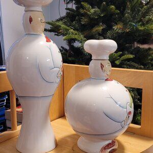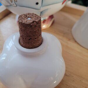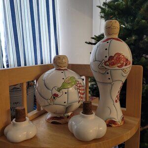 Vintage Godinger & Co Ceramic Oil Liquid Dispenser Italian Fat Chef Containers. Ceramic with no chips or stains. The tall chef's cork has been nailed together after being split. Please see pictures for further description.