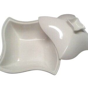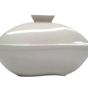 This ceramic serving dish features a sleek sculpted lid and a unique modern design, making it a functional and elegant addition to your kitchen.