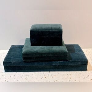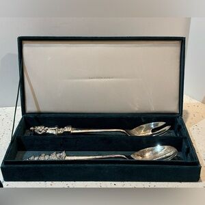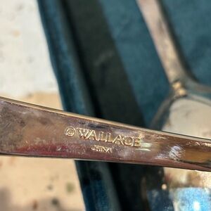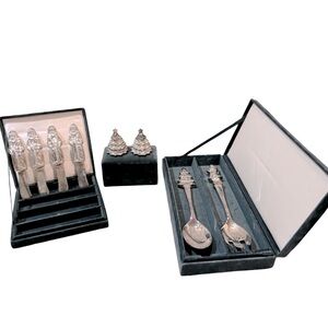 The Spoon/Fork set is Wallace Silver possibly plated. All the rest is Godinger Silver Art Co. however they all go well together. Please see all photos and all the green velvet boxes are included. Sets all needs to be polished, sold as is. Sets have been used and may have scratches.
