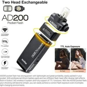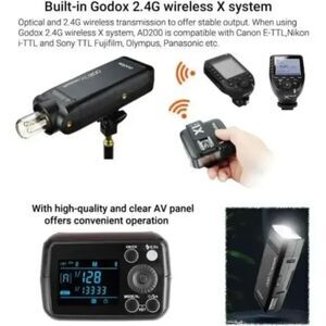 Compatibility: Built-in 2.4G Wireless X System to offer stable output, allow AD200 work with 2.4G X System Godox products, such as godox flash, TTL outdoor flash, and X1, X2, XPro, XProII, X3 triggers(Please select the specific model for your camera such as XPro-C trigger for canon camera); compatible for Nikon, Canon, Sony, Olympus Panasonic Fuji and Pentax