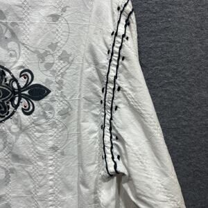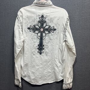 The Godsend Men's Gothic rock Western Cross Novelty Distressed Shirt in White, Size Large, is a vintage-inspired button-up shirt with a graphic print featuring Western and Gothic themes. Made of cotton with a woven fabric type, this long sleeve shirt has a collared neckline and button closure. Suitable for various occasions including casual, formal, and parties, this lightweight and easy-care shirt is a stylish addition to any man's wardrobe. Perfect for those who appreciate unique and edgy fashion choices with a touch of vintage flair.
