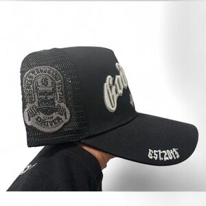 Stylish black mesh trucker hat featuring bold white embroidery. Perfect for casual wear.