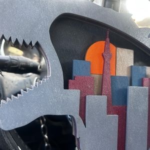 beautiful painted, handmade woodcut of godzilla and a cityscape painted inside. perfect for any godzilla fan to hang on the wall. comes with tab to hang on a wall