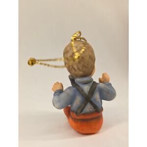 Sweet 1997 Goebel Berta Hummel ornament of a boy seated with a puppy popping out of a gift box. Hand-painted, 2" tall, marked Goebel 1997 on base.